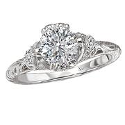 Vintage Style Diamond Ring with Round Accent Stones and Filigree Detail in 18kt White Gold. (D1 1/2 carat total weight) This item is a SEMI-MOUNT and it comes with NO CENTER STONE as shown but it will accommodate a 5.5-6mm princess cut center stone.